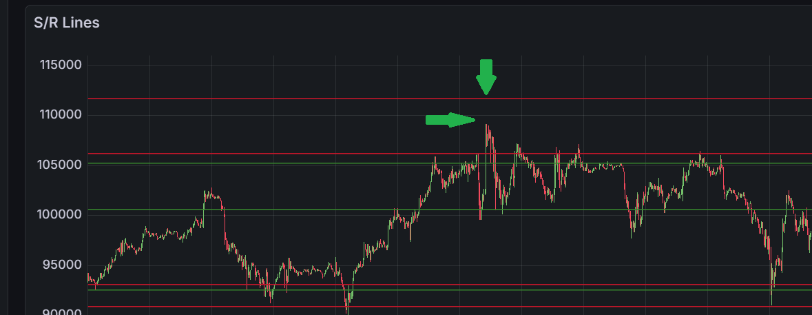 OK, the outputs are looking good. With more data, I see a slight issue with the extreme highs. If we keep to the Q1 time frame, the extreme highs are above the very top price level in the Q1 frame. This is because we now have more data (Q1 & Q2), a larger dataset. We now have a new extreme high in this dataset, so we're just seeing the new S/R line set by data outside of this time range. Let's make a note of this—it's not a showstopper at this point.