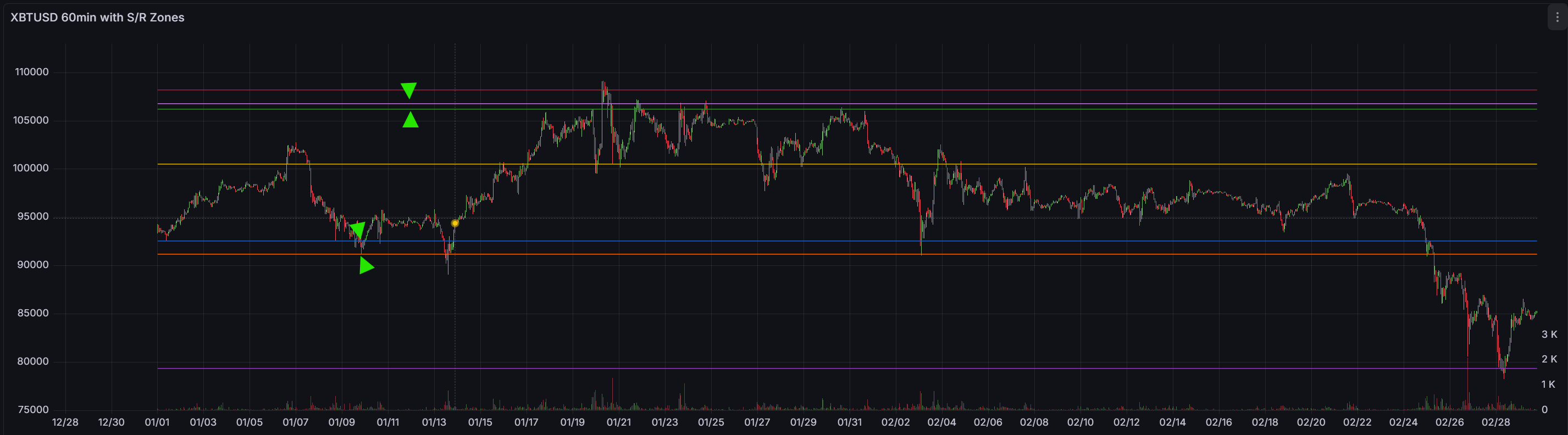 One more important design decision: zones don't have a fixed "support" or "resistance" type. Instead, their role is calculated dynamically based on current price. If price is at $94,000 and a zone is at $95,000, the zone is resistance (it's above us). If price climbs to $96,000, that same zone becomes support (it's below us). This eliminated the need to classify zones at creation time—the market tells us what role each zone plays right now.